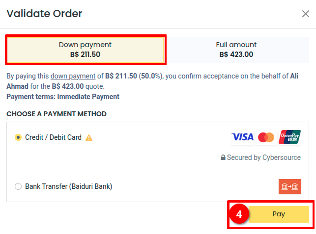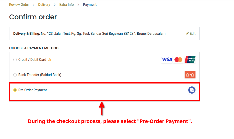 Ensure that "Pre-Order Payment" is selected during checkout.